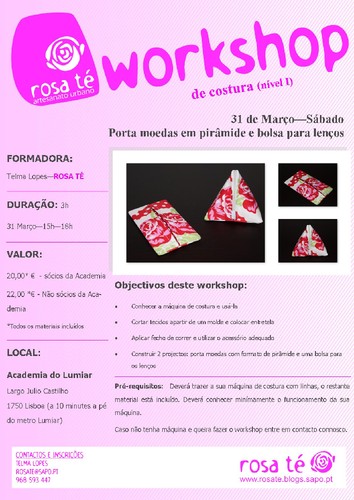 No próximo dia 31 de Março, sábado das 15h às 18h, na Academia do Lumiar, vamos fazer um porta-moedas em pirâmide e uma bolsa para lenços de papel. São 2 projectos simples para quem se quer iniciar e aventurar na costura.